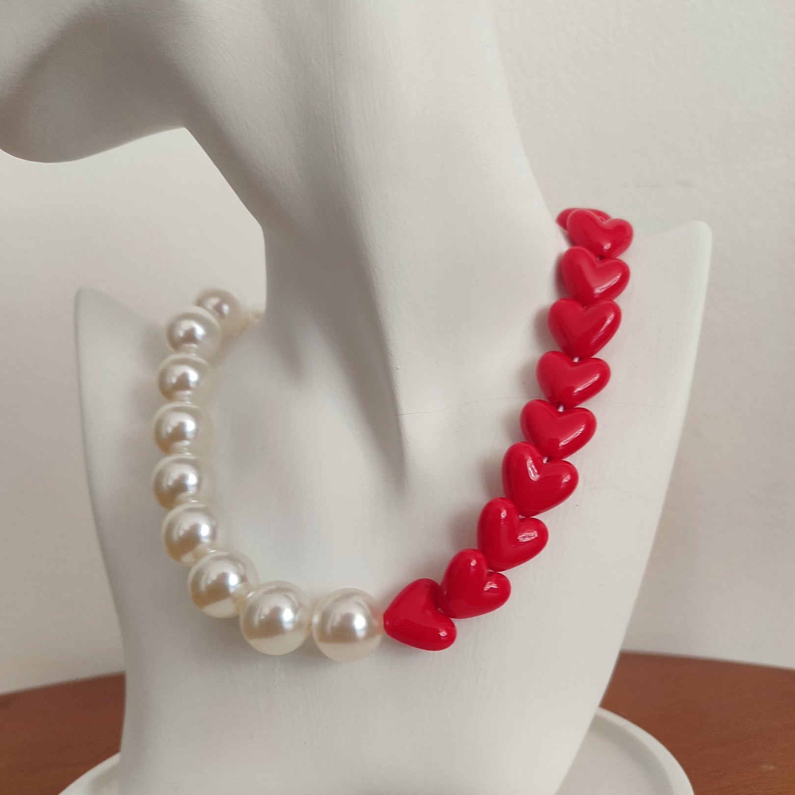 Descubre el collar Eli de Datura accesorios: perlas clásicas y corazones rojos hechos a mano que elevan cualquier look. Diseño único, romántico y artesanal.